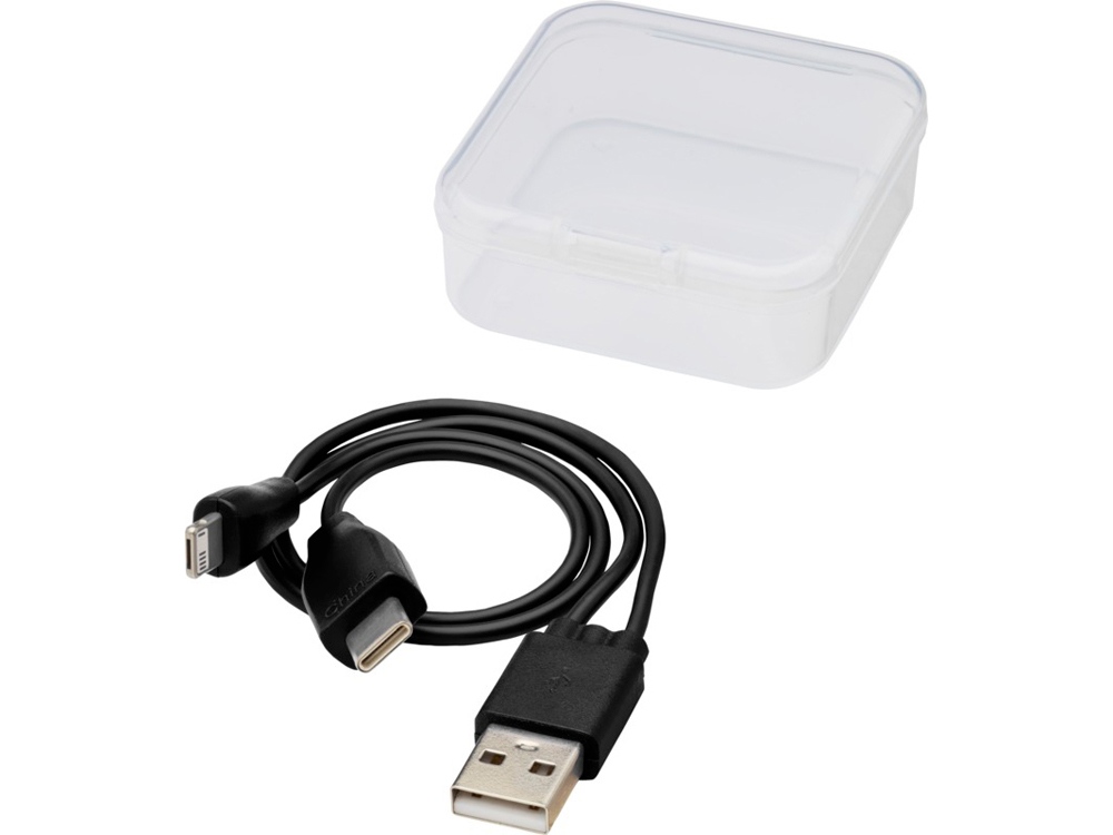 Зарядный кабель 3-в-1 оснащен разъемом USB типа С и двойным разъемом 2-в-1, подходящим для устройств как на Apple® iOS, так и на Android. Micro USB и разъем 2-в-1 до 2 А. Разъем Type-C до 3 А. Поставляется в защитном футляре.
