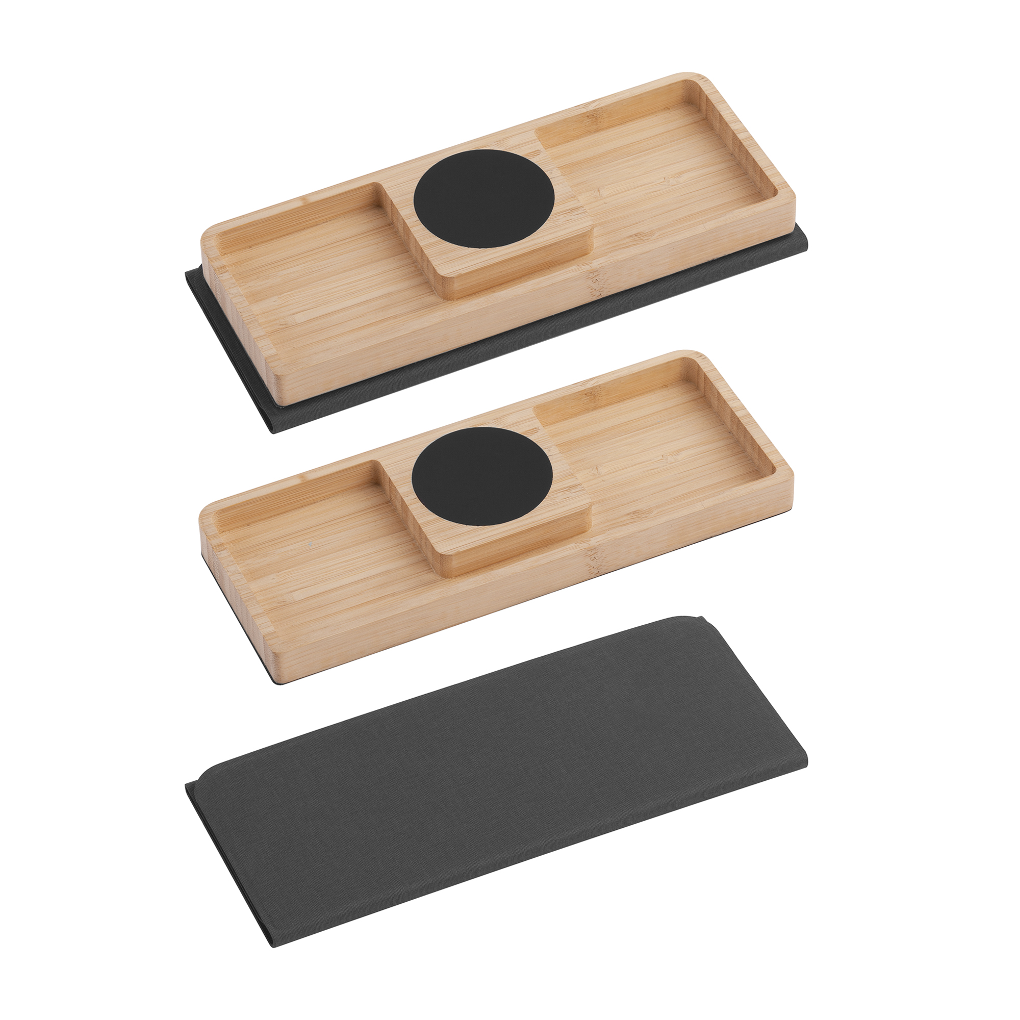Оригинальный набор - бамбуковая подставка-органайзер с быстрой беспроводной зарядкой с подсветкой логотипа и складной коврик-трансформер для мыши. Оба предмета могут превратиться в единую настольную конструкцию - органайзер может присоединиться к коврику с одной из сторон (справа или слева) при помощи встроенных магнитов.