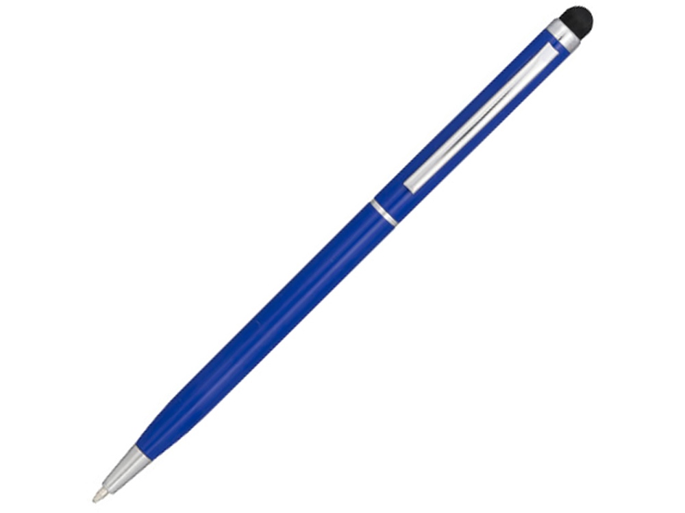 Алюминиевая шариковая ручка Joyce. Тонкая алюминиевая шариковая ручка с поворотным механизмом и стилусом. Алюминиевый корпус с металлическим зажимом и кольцом посередине, остальные элементы из пластика.