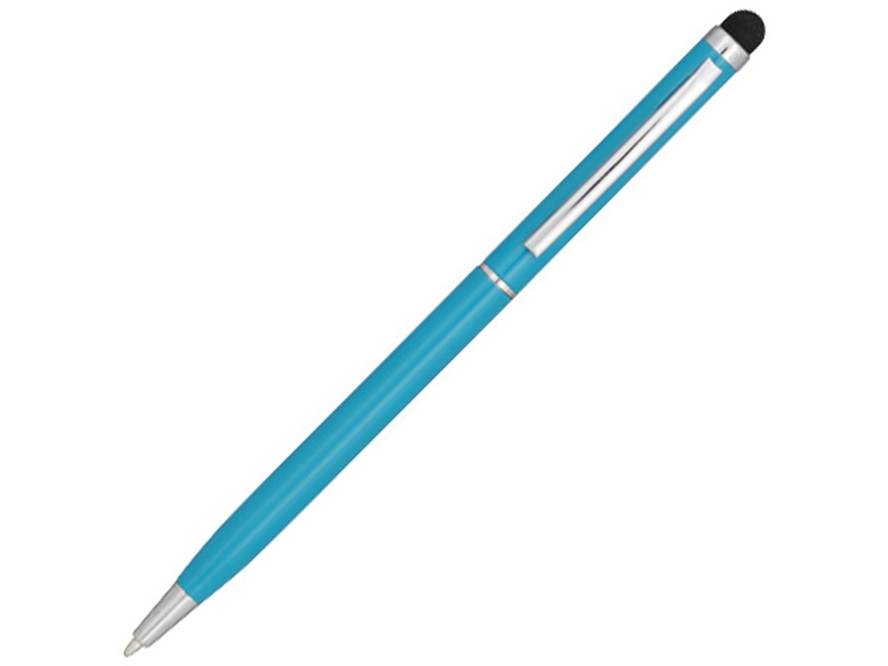 Алюминиевая шариковая ручка Joyce. Тонкая алюминиевая шариковая ручка с поворотным механизмом и стилусом. Алюминиевый корпус с металлическим зажимом и кольцом посередине, остальные элементы из пластика.