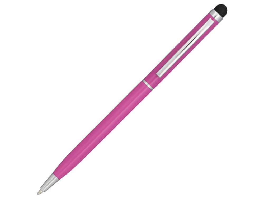 Алюминиевая шариковая ручка Joyce. Тонкая алюминиевая шариковая ручка с поворотным механизмом и стилусом. Алюминиевый корпус с металлическим зажимом и кольцом посередине, остальные элементы из пластика.