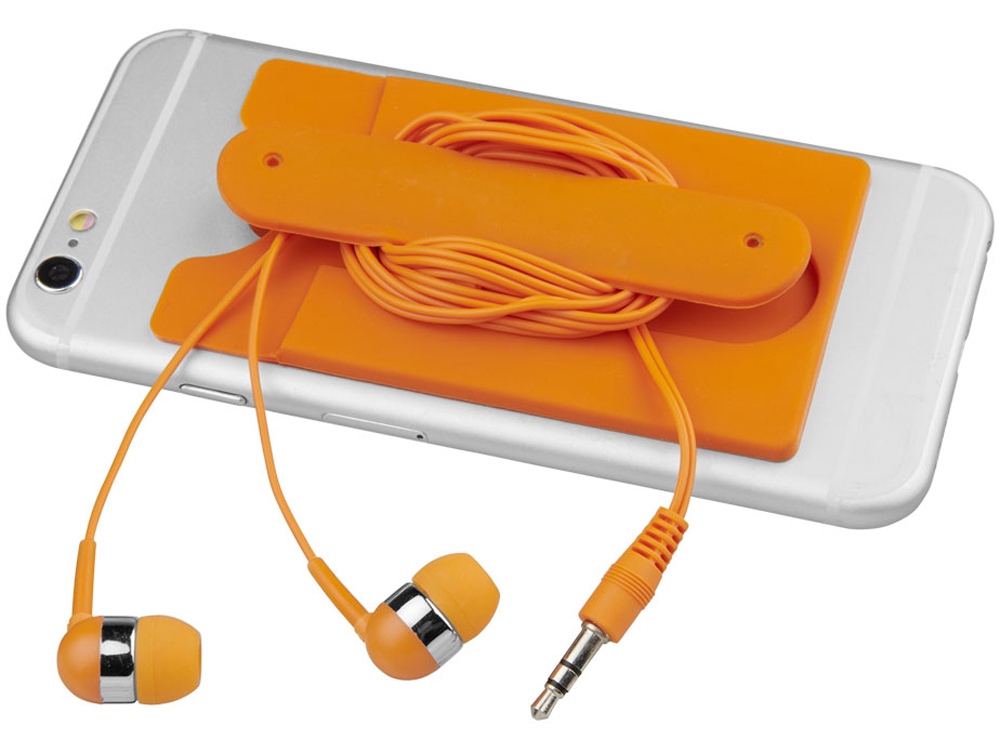 Проводные наушники и силиконовый бумажник для телефона. Мягкий силиконовый бумажник для телефона с подставкой с клейкой полоской для удобного крепления к задней поверхности телефона вмещает 2-3 кредитных карты и/или удостоверения личности. Его также можно использовать в качестве подставки для телефона или для хранения наушников. Включает проводные наушники. Силикон. Тампопечать (1 цвет (цветные изделия)) на данный товар осуществляется бесплатно. Оплачивается только настройка оборудования в размере 3600 рублей на весь тираж.