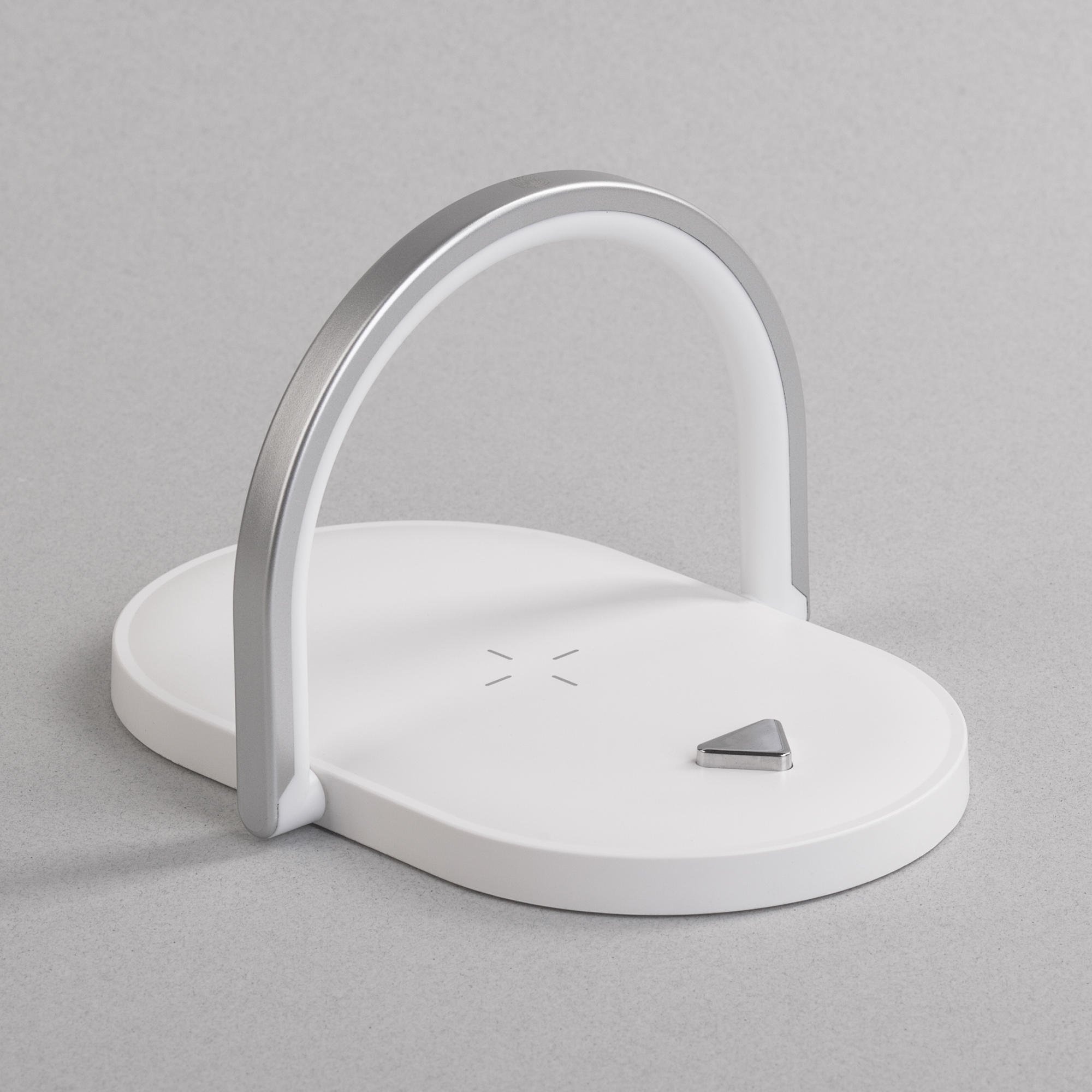 У треугольной кнопки 2 положения – при размещении на ней гаджета она будет «утоплена» вровень с плоскостью зарядного блока (для удобного размещения гаджетов для зарядки) или быть выше поверхности зарядного блока (использование её в качестве подставки для смартфона).
