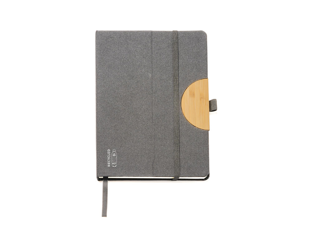 Блокнот формата А5 с жесткой обложкой из RPET с функцией подставки. Эластичная застежка, закладка и держатель для ручки. 80 листов.