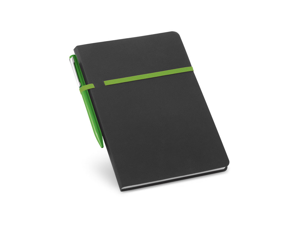 Блокнот формата A5 из искусственной кожи с 192 чистыми страницами и держателем для шариковой ручки (в комплекте). Поставляется в чехле из нетканого материала под цвет резинки. Блокнот: 140 x 210 мм | Шариковая ручка: ø10 x 138 мм | Мешок: 185 x 240 мм. Вид нанесения, рекомендуемый поставщиком: трафаретная печать, горячее тиснение.
