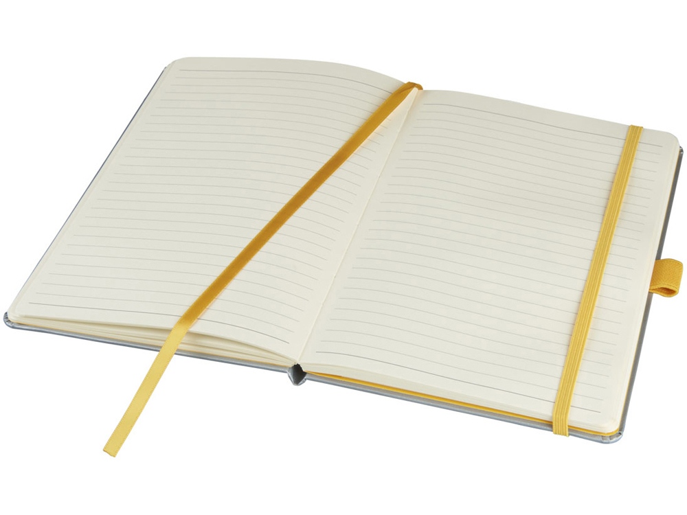 Цветной блокнот Melya. Стильный блокнот (размер А5 для ориентации) для креативных профессионалов, чтобы делать заметки, наброски или рисовать. Обложка различных цветов с эластичной застежкой в цвет и закладкой придает блокноту особый, свежий вид. 40 листов кремовой линованной бумаги (80 г/м2) и 40 листов чистой бумаги (80 г/м2) с кармашком для заметок и бумаг. Упакован в коробку-рукав. Бумага в виде кожзаменителя. Тиснение (Блинт) на данный товар осуществляется бесплатно. Оплачивается только настройка оборудования в размере 5800 рублей на весь тираж.