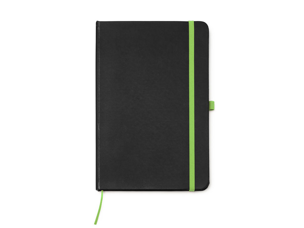 Блокнот формата А5 в твердой обложке из черного полиуретана. Цветная закладка, резинка и держатель для ручки. 80 листов в линейку.