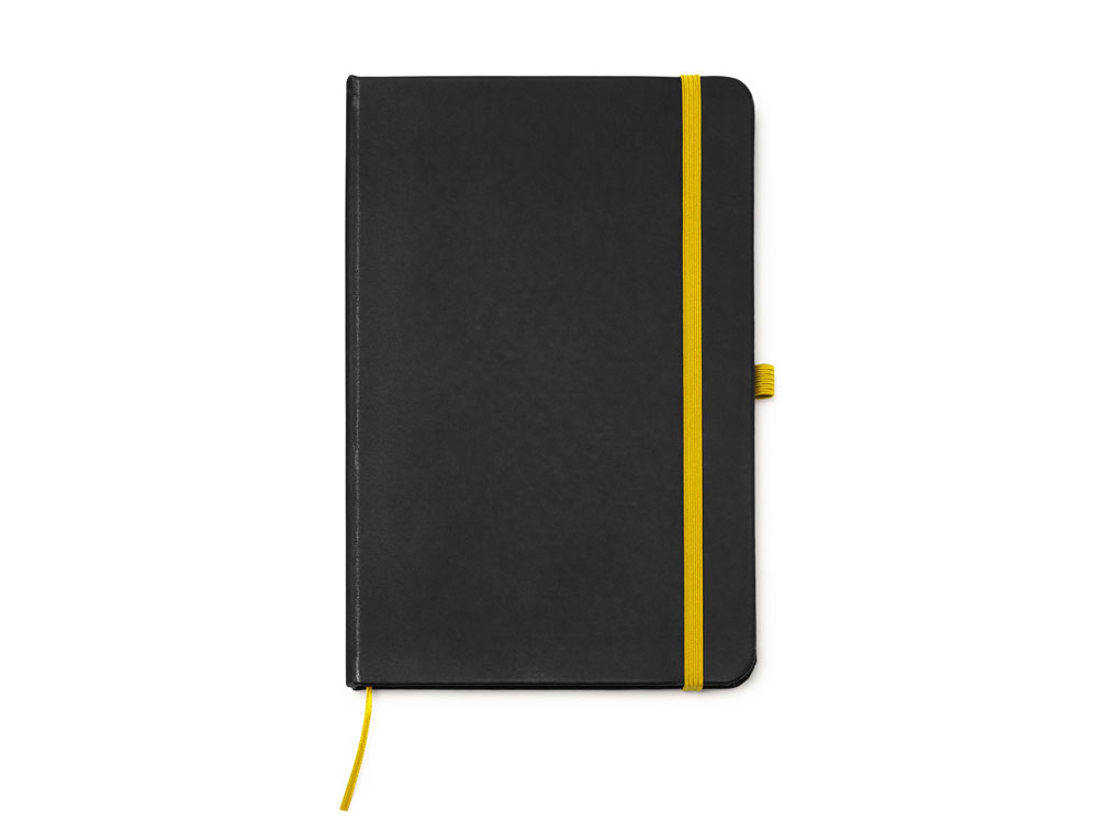 Блокнот формата А5 в твердой обложке из черного полиуретана. Цветная закладка, резинка и держатель для ручки. 80 листов в линейку.