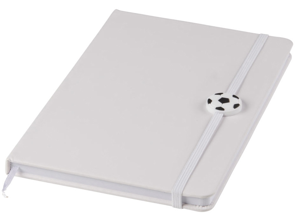 Блокнот А5 с эластичной цветной резинкой с футбольным мотивом и закладкой. 80 страниц (70g/m2) линованной бумаги с мячом в нижнем внешнем углу. На первой странице изображено футбольное поле. Идеальный подарок для футболистов.