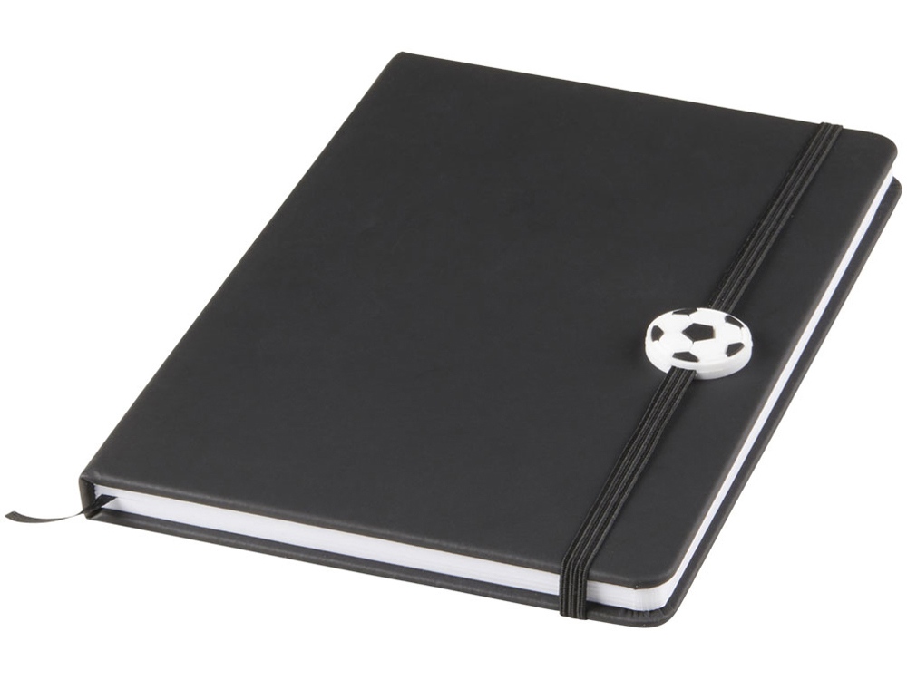 Блокнот А5 с эластичной цветной резинкой с футбольным мотивом и закладкой. 80 страниц (70g/m2) линованной бумаги с мячом в нижнем внешнем углу. На первой странице изображено футбольное поле. Идеальный подарок для футболистов.