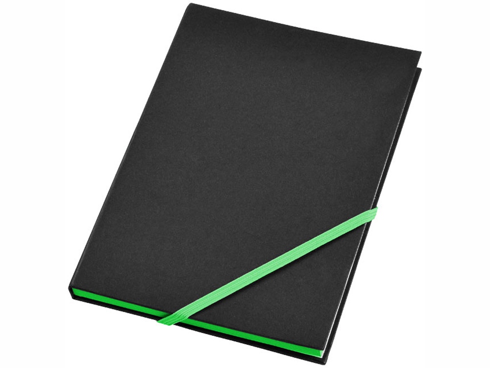 Блокнот, ориентировочный формат A5 с 80 листами бежевой бумаги (70 г/м²) с диагональной эластичной застежкой и яркими неоновыми краями.