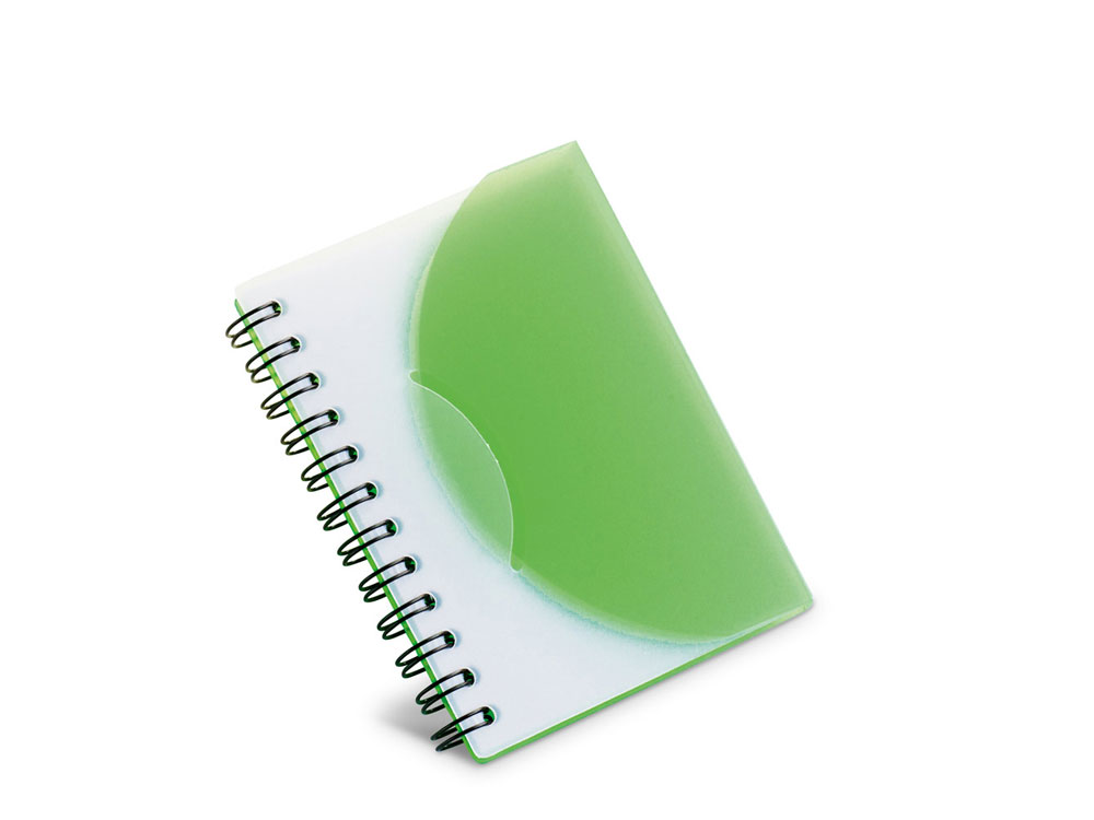 Блокнот A7 со спиралью с 160 страницами без линовки с полужёсткой обложкой из материала PP. Вид нанесения, рекомендуемый поставщиком: трафаретная печать
