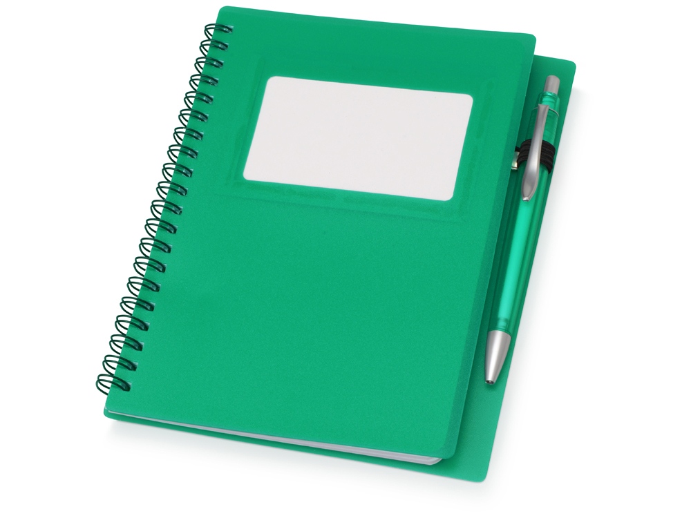Блокнот Контакт в полипропиленовой обложке переплетен на пружине. В обложке блокнота предусмотрено окошко, в которое можно поместить визитную карточку или полиграфическую вставку. В комплекте с блокнотом идет ручка, которая вставляется в петельку сбоку.