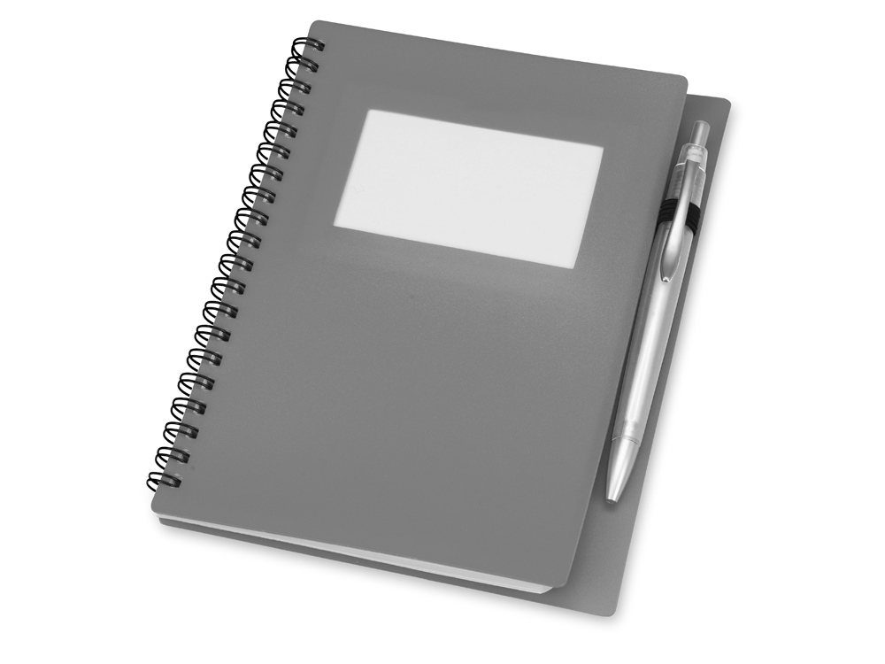 Блокнот Контакт в полипропиленовой обложке переплетен на пружине. В обложке блокнота предусмотрено окошко, в которое можно поместить визитную карточку или полиграфическую вставку. В комплекте с блокнотом идет ручка, которая вставляется в петельку сбоку.
