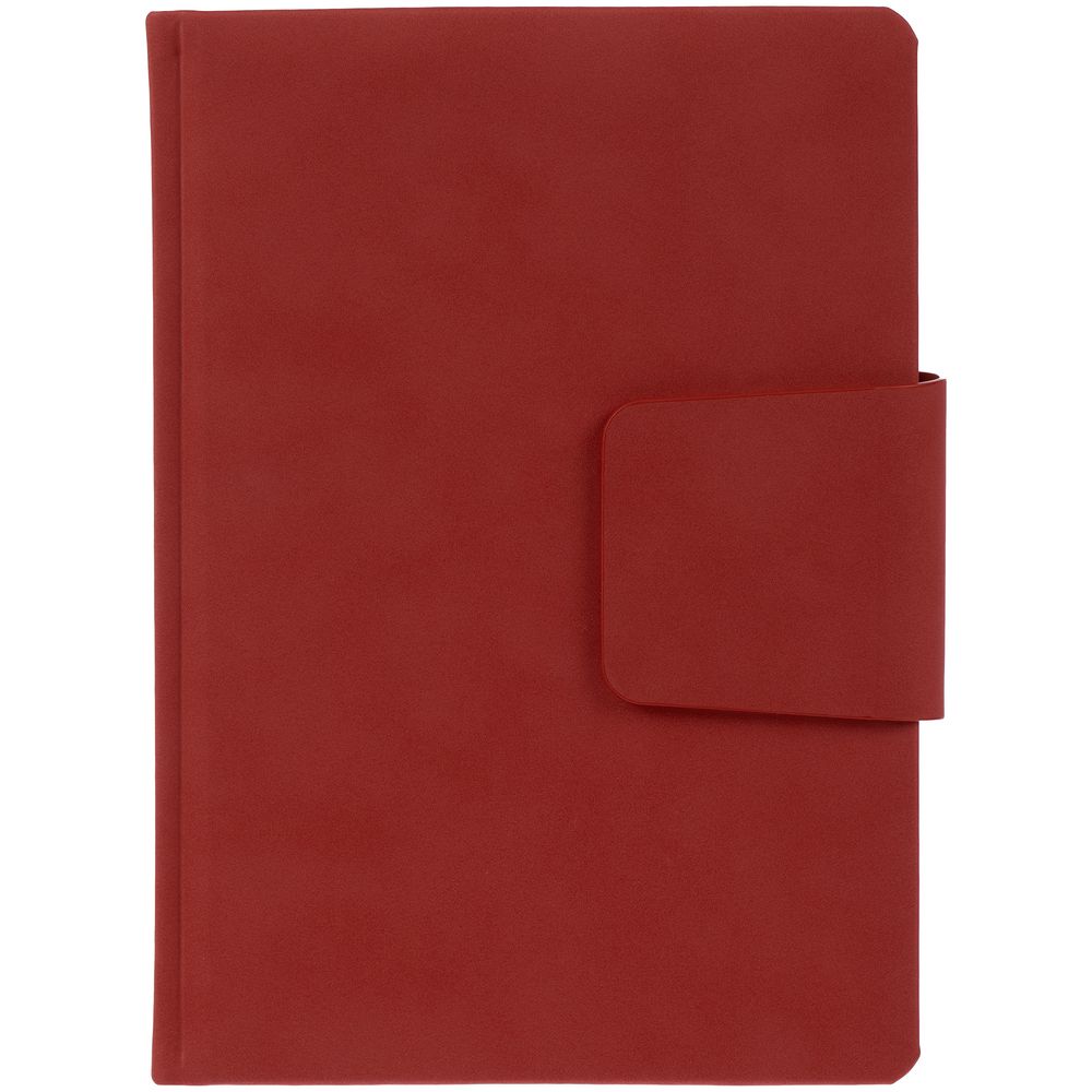 Ежедневник с твердой обложкой c поролоном, выполнен из материала Nubuck, красный РР, дополнен капталом и ляссе в цвет обложки. Застежка — хлястик на магните.