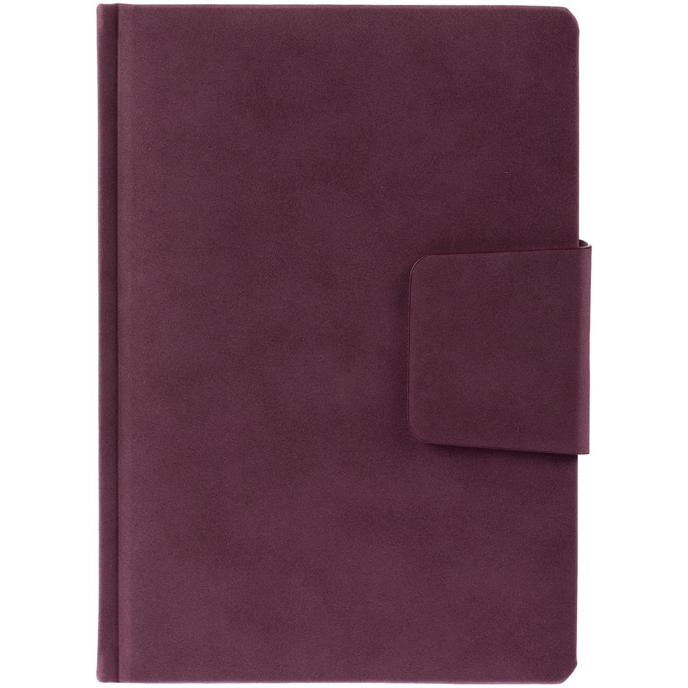 Ежедневник с твердой обложкой c поролоном, выполнен из материала Nubuck, красный РР, дополнен капталом и ляссе в цвет обложки. Застежка — хлястик на магните.