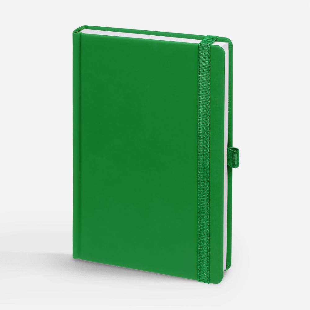 Ежедневник с твердой обложкой без поролона, выполнен из материала Soft Touch Ultra, зеленый FF, дополнен резинкой шириной 1 см, петлей-резинкой для ручки, капталом и ляссе ярко-зеленого цвета.