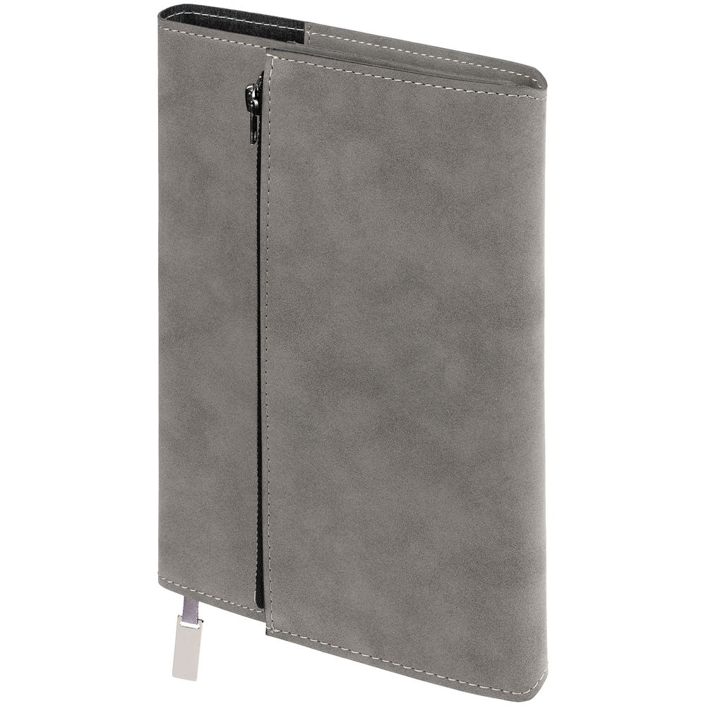 Ежедневник в гибкой суперобложке c карманом на молнии, выполнен из материала Nubuck, серый СС. Дополнен капталом и металлической шильдой на ляссе серого цвета.