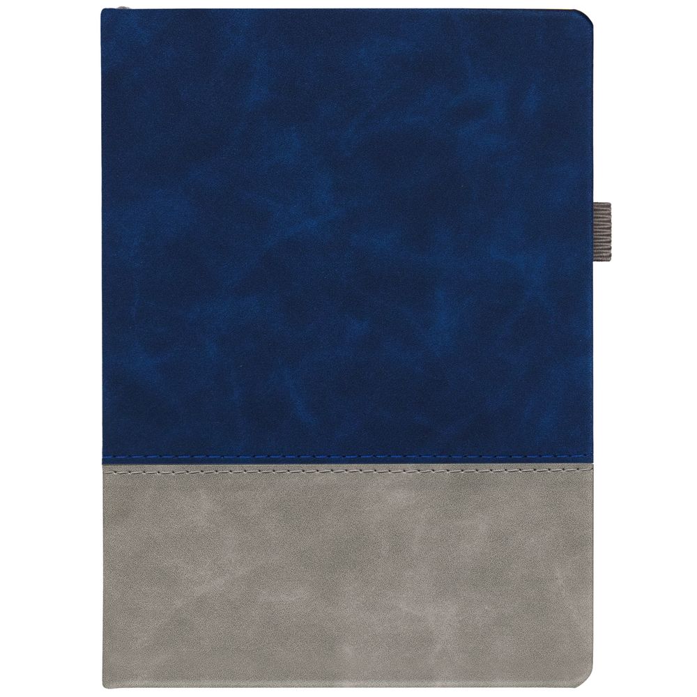 Ежедневник с твердой обложкой, без поролона, со сшивкой материалов Nubuck Touch, серый СС, и Nubuck Touch голубой JJ, дополнен двойным ляссе и петлей-резинкой для ручки.