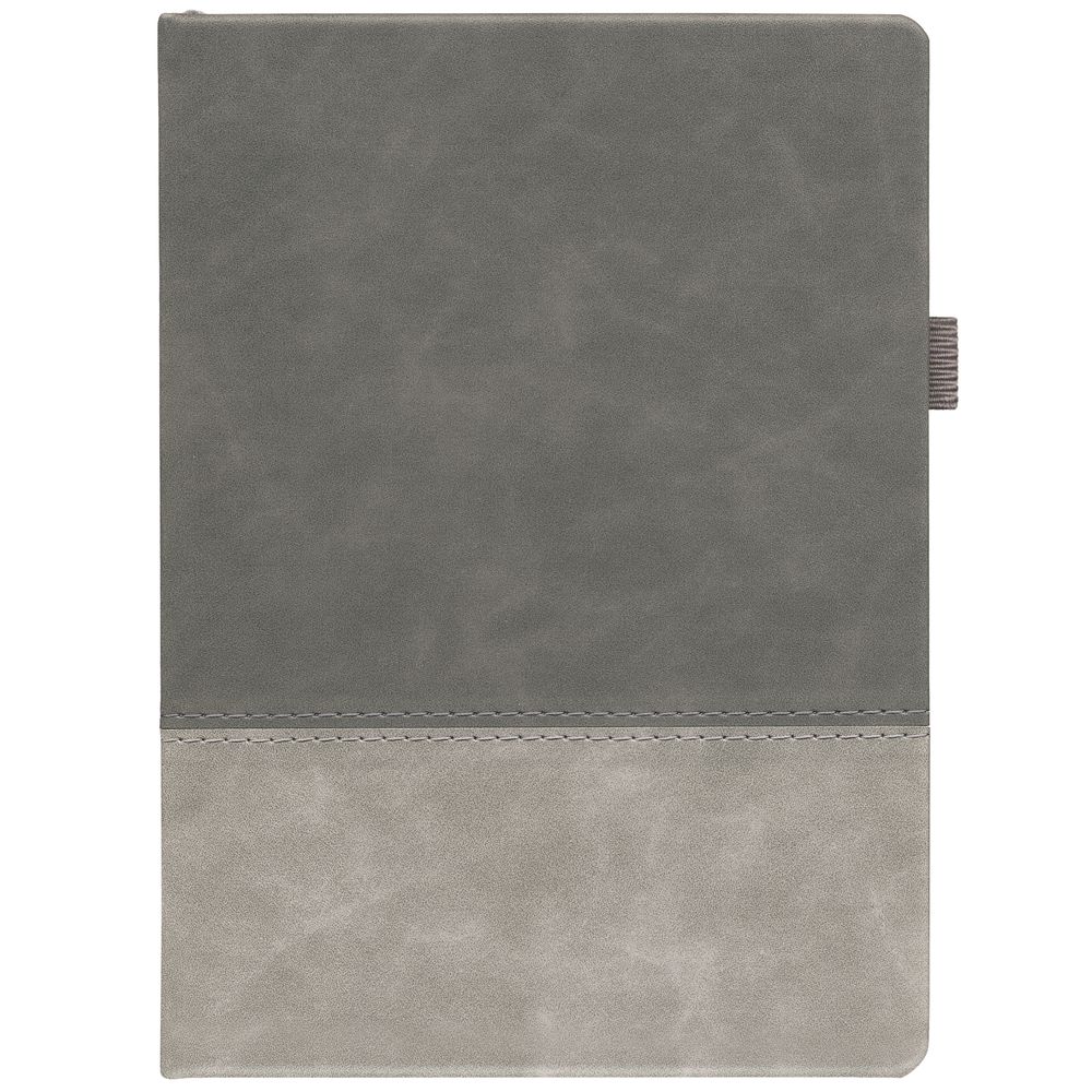 Ежедневник с твердой обложкой, без поролона, со сшивкой материалов Nubuck Touch, серый СС, и Nubuck Touch голубой JJ, дополнен двойным ляссе и петлей-резинкой для ручки.