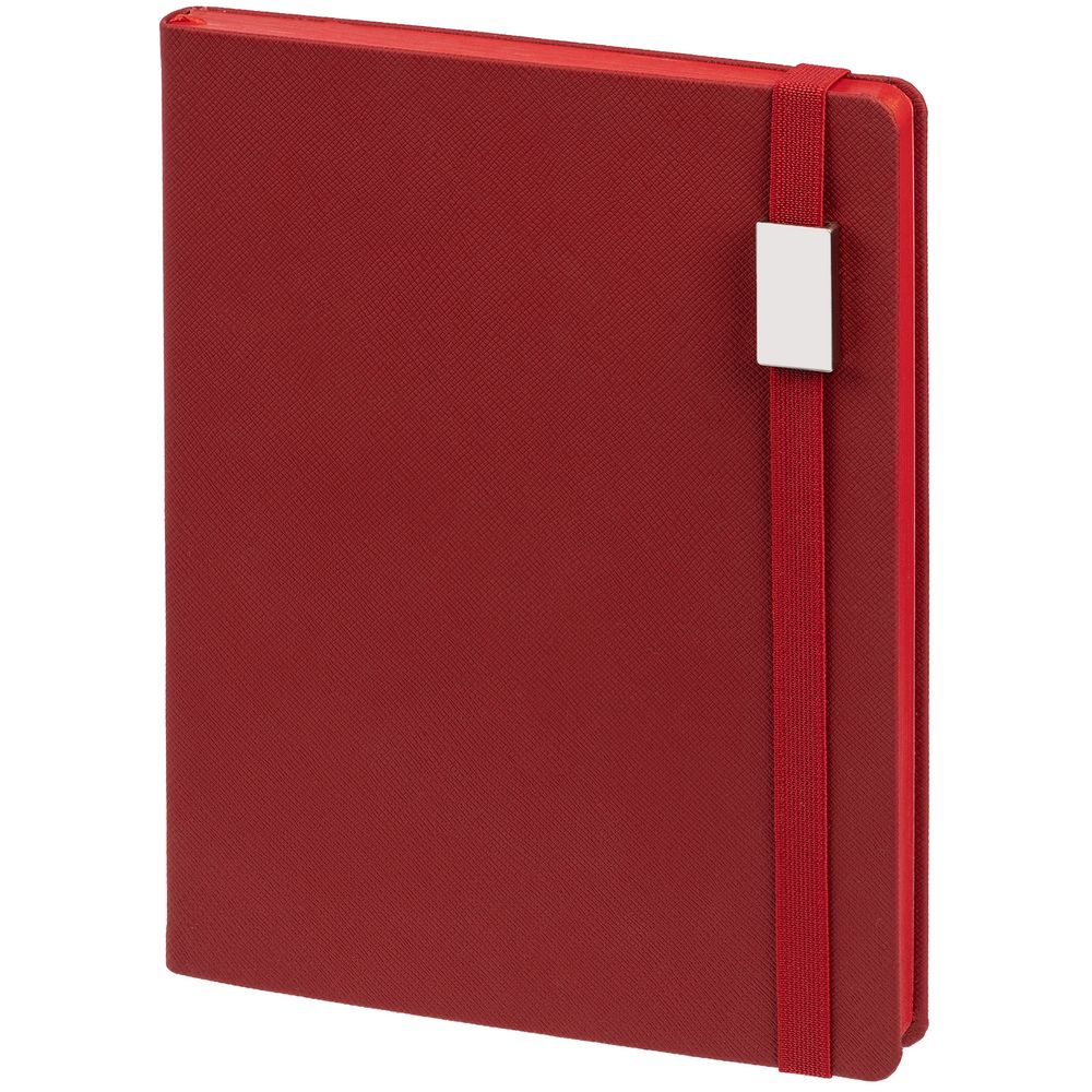 Ежедневник с полутвердойобложкой выполнен из материала Nice Touch, красный PP, и дополнен резинкой шириной 1 см с металлическим шильдом и ляссе красного цвета.