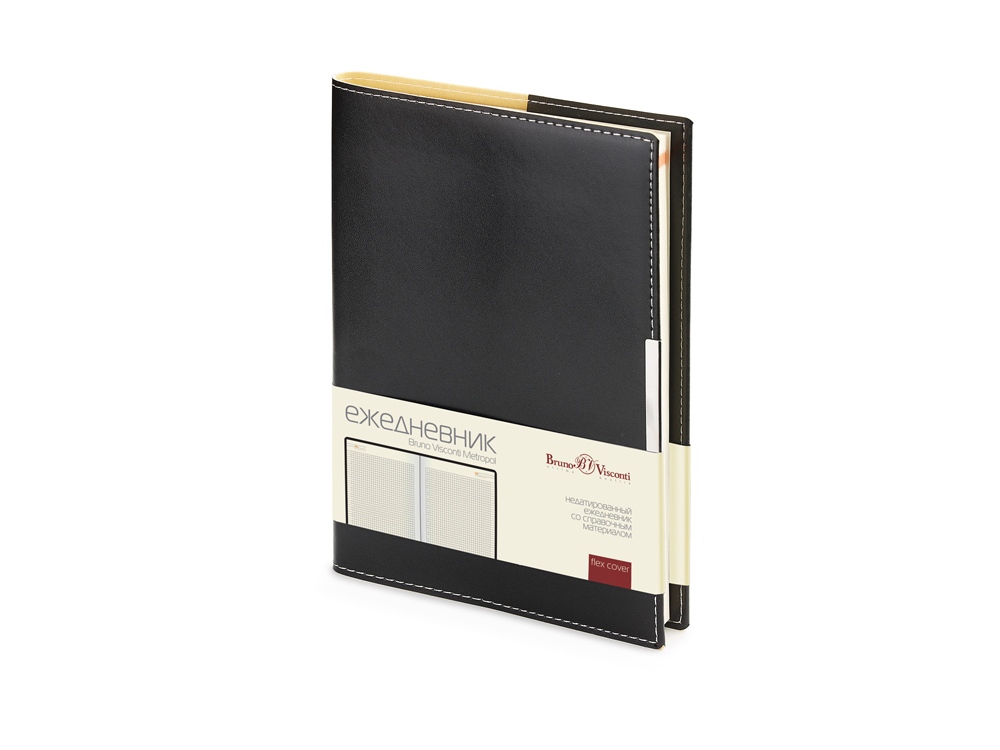 Удобный и практичный недатированный ежедневник в мягкой обложке из прочного переплетного материала. Контрастная прострочка белыми нитками по периметру привлекает внимание к изящной форме обложки с закругленными уголками. Обложка украшена металлическим шильдом. Линовка блока - клетка, с указанием времени дня. Формат удобен для ведения регулярных записей. Готов к персонализации.