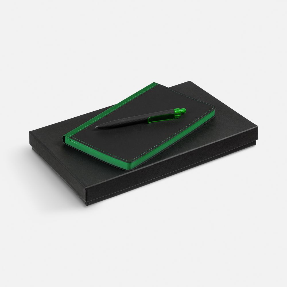 Стильный двухцветный ежедневник с гибкой обложкой и цветным обрезом, а также ручка в тон.