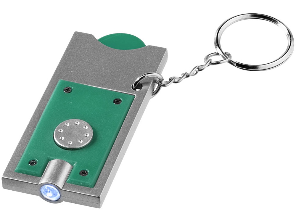 Брелок-держатель для монет Allegro с фонариком для ключей. Пластиковый держатель для монет достоинством 1 евро размером Ø 6 мм с одним белым светодиодом для ключей. Металлическое кольцо для ключей Ø 25 мм. Батарейки включены в комплект и вставлены. АБС-пластик.