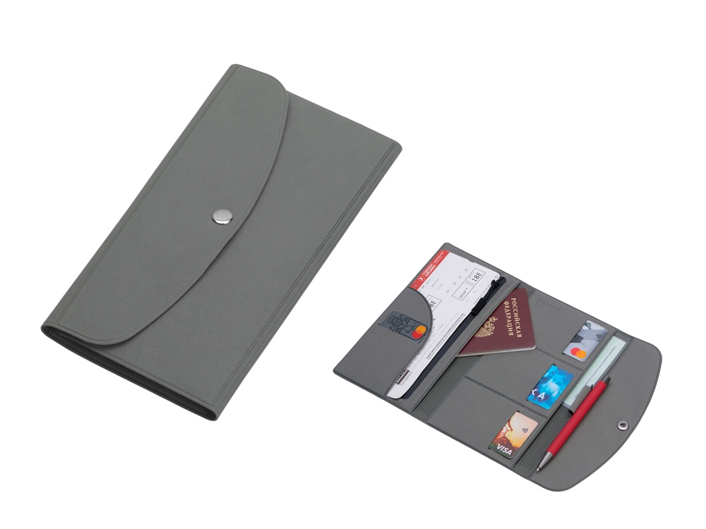Органайзер для документов на кнопке с отделением для купюр и ручки, упаковка в индивидуальный пакет, серый
