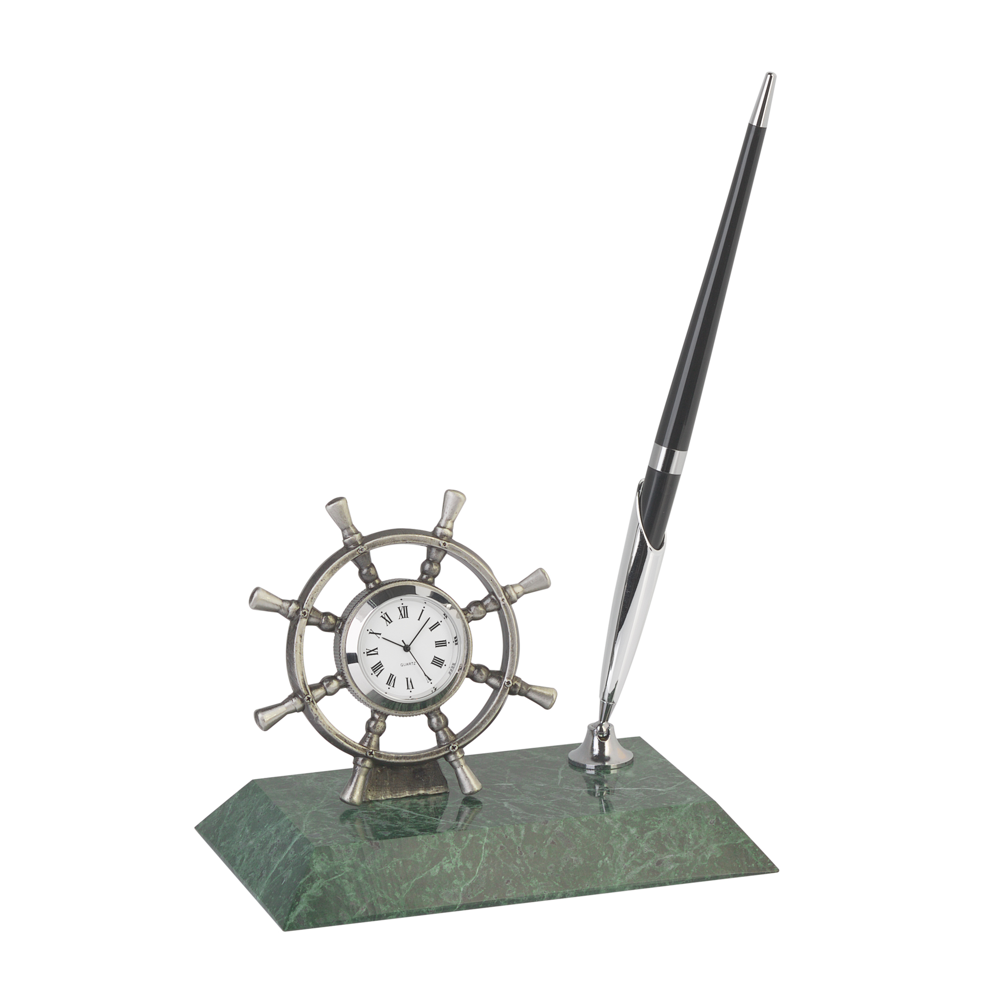 Подставка "Штурвал" с часами и ручкой, серебристый с зеленым