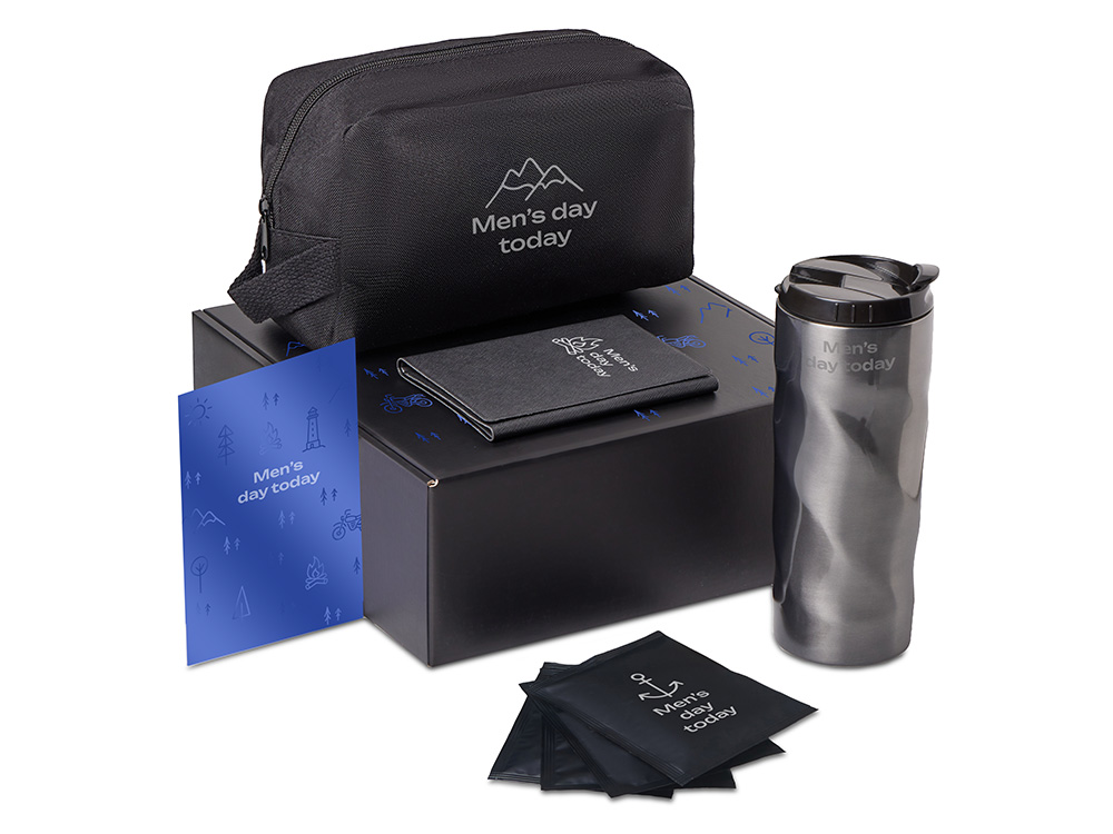 термокружка - нержавеющая сталь, пластик; кофе в дрип пакете - пластик; обложка для паспорта - полиуретан; косметичка - переработанный оксфорд; мешок - нетканый материал (спанбонд)