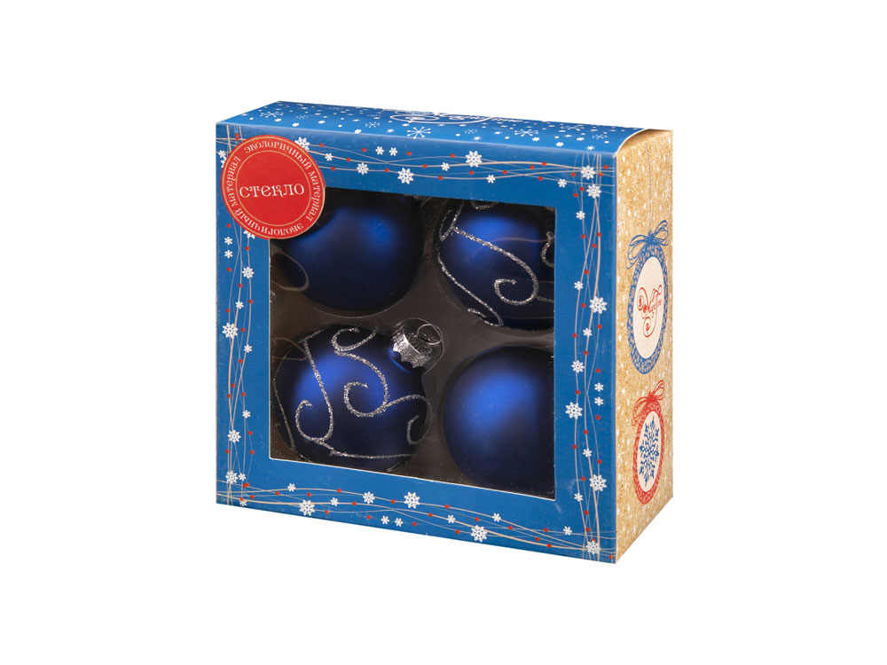 Новогоднее подвесное украшение - шар Синий с золотом из стекла, набор из 4 штук / 6x6x6см
