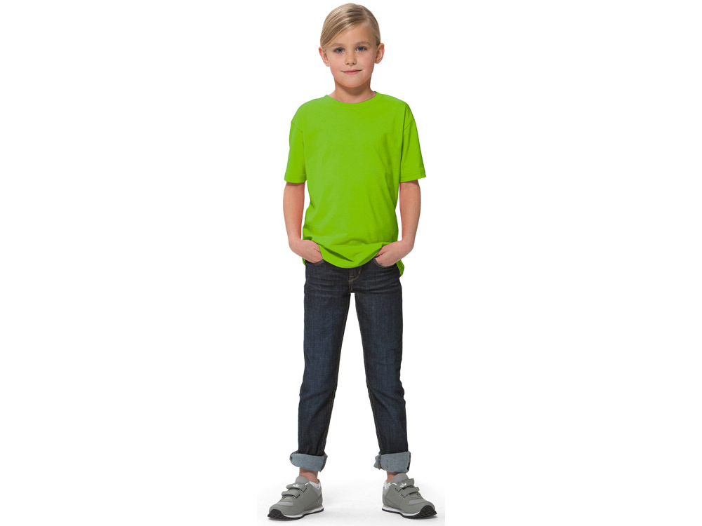 Детская футболка с короткими рукавами Ace. Детская модель со швами по бокам. Резинка с эластаном и двойной строчкой на воротнике. Лента от плеча к плечу. Однослойная джерси, 100% хлопок. 150 г/м².