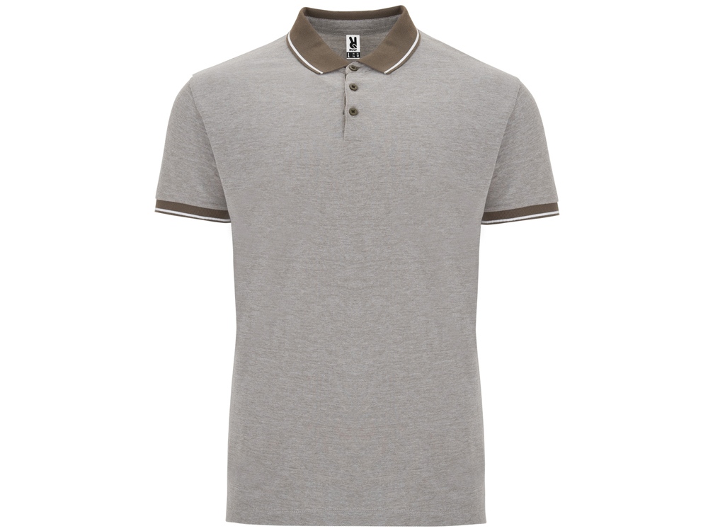 Рубашка поло с коротким рукавом. Манжеты и воротник из однотонного риба 1х1 с контрастными полосками. Планка на 3 пуговицы. Низ с боковыми разрезами, отделанными тесьмой. Спинка немного длиннее полочки. Полотно с меланжевым эффектом.