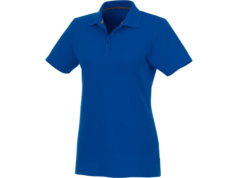 Женское поло Helios с коротким рукавом. Женская модель с разрезами по бокам. Отрезной-отрывной ярлык для комфорта. Воротник гладкой вязкой в рубчик. Планка с тремя пуговицами. Двойная строчка на воротнике и внизу изделия. Пуговицы в цвет изделия. Полоска на горловине в контрастном цвете. Трикотаж Piqué, 100 % хлопок. 180 г/м².