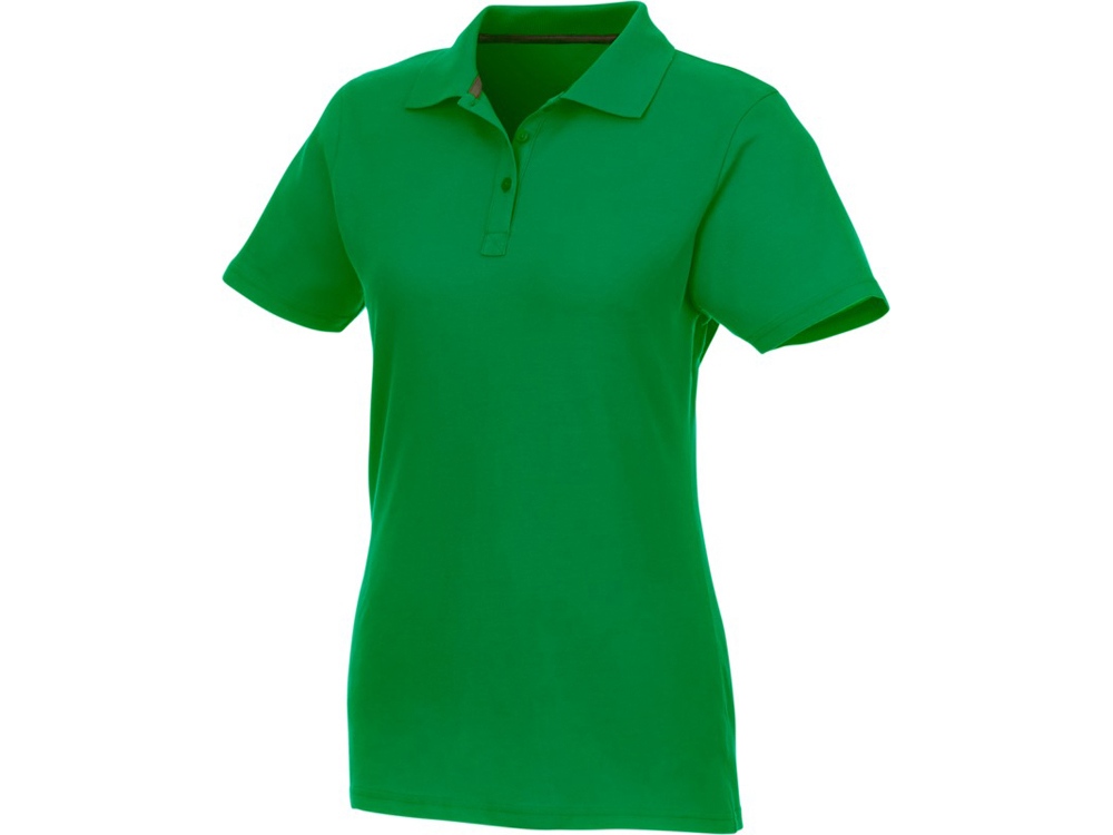 Женское поло Helios с коротким рукавом. Женская модель с разрезами по бокам. Отрезной-отрывной ярлык для комфорта. Воротник гладкой вязкой в рубчик. Планка с тремя пуговицами. Двойная строчка на воротнике и внизу изделия. Пуговицы в цвет изделия. Полоска на горловине в контрастном цвете. Трикотаж Piqué, 100 % хлопок. 180 г/м².
