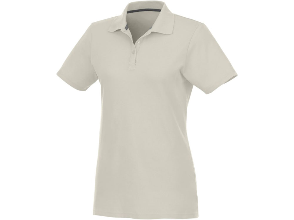 Женское поло Helios с коротким рукавом. Женская модель с разрезами по бокам. Отрезной-отрывной ярлык для комфорта. Воротник гладкой вязкой в рубчик. Планка с тремя пуговицами. Двойная строчка на воротнике и внизу изделия. Пуговицы в цвет изделия. Полоска на горловине в контрастном цвете. Трикотаж Piqué, 100 % хлопок. 180 г/м².