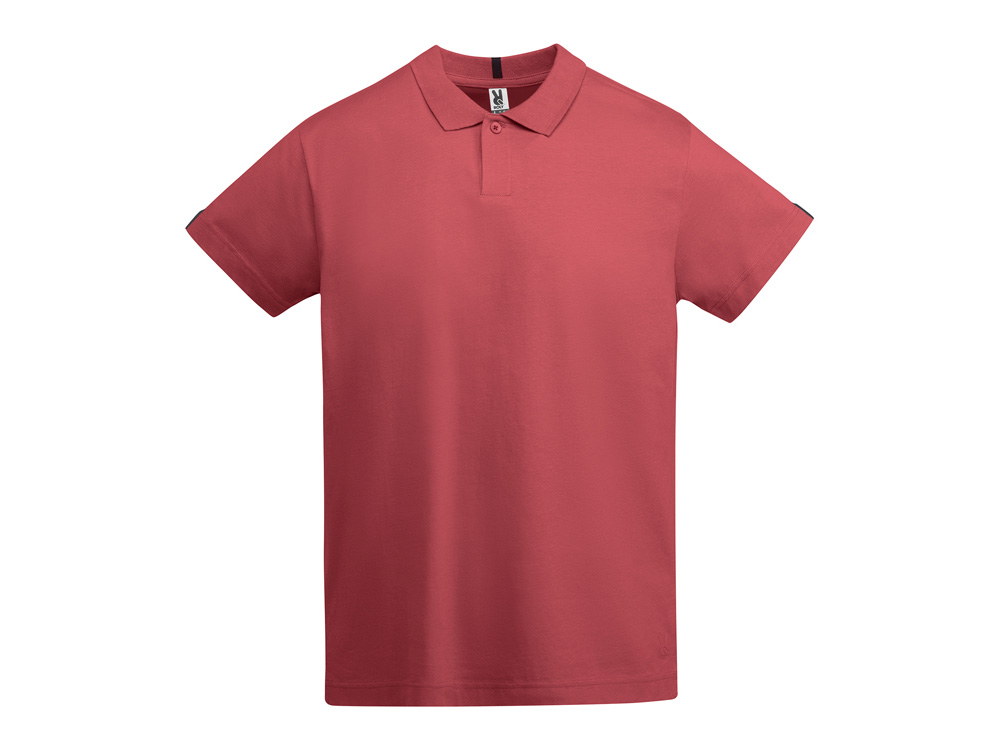 Рубашка поло с коротким рукавом из однотонного трикотажа. Воротник в рубчик 1x1. Разрез с застежкой на 1 пуговицу. Усиленные закрытые швы в воротнике. Боковые разрезы на подоле. Контрастная тесьма в елочку по низу рукава и на воротнике. Логотип Roly внутри.