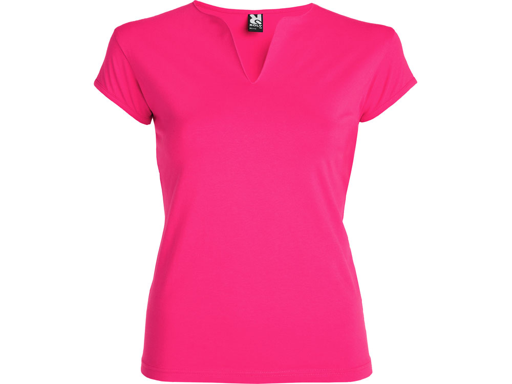 Приталенная женская футболка с круглым вырезом и v-образным разрезом спереди. Двойная отстрочка по рукавам и низу изделия.