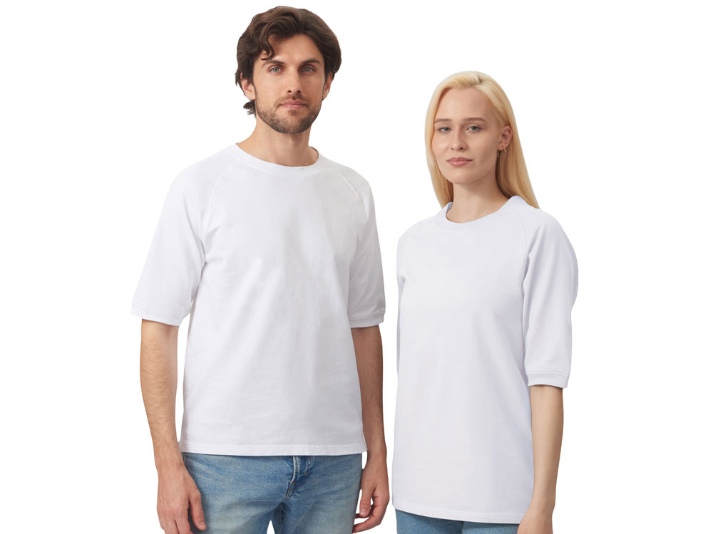 Футболка выполнена из хлопкового френч терри с петельками на изнаночной стороне. Горловина обработана рибом 2х2 и дополнительно усилена тесьмой-елочкой с внутренней стороны спинки и дополнена кокеткой по спинке для нанесения логотипа клиента. Рукав реглан продублирован рибом по низу. Разрезы в боковых швах. Гладкая поверхность полотна позволяет идеально нанести изображение. Футболка комфортного силуэта.