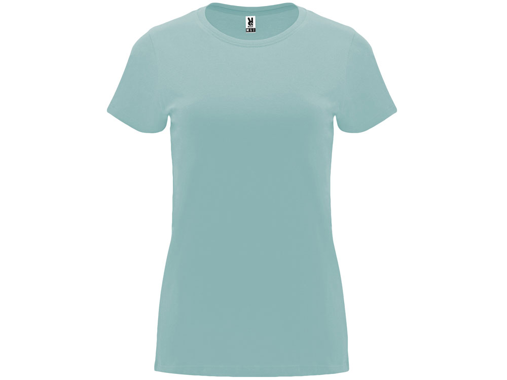 Женская приталенная футболка. Круглый вырез горловины обработан рибом 1х1. Шов горловины укреплен тесьмой.