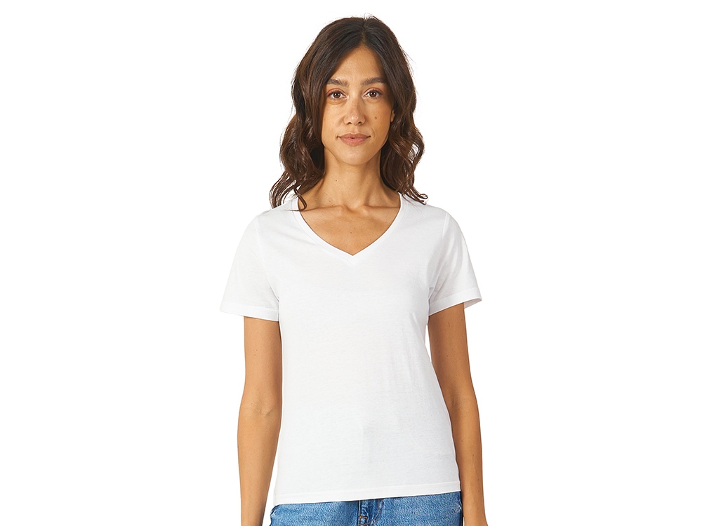 Женская футболка из натурального хлопка с элегантным V-образным вырезом. Материал отлично подходит для нанесения рекламной информации. Натуральная ткань не вызывает раздражения кожи.