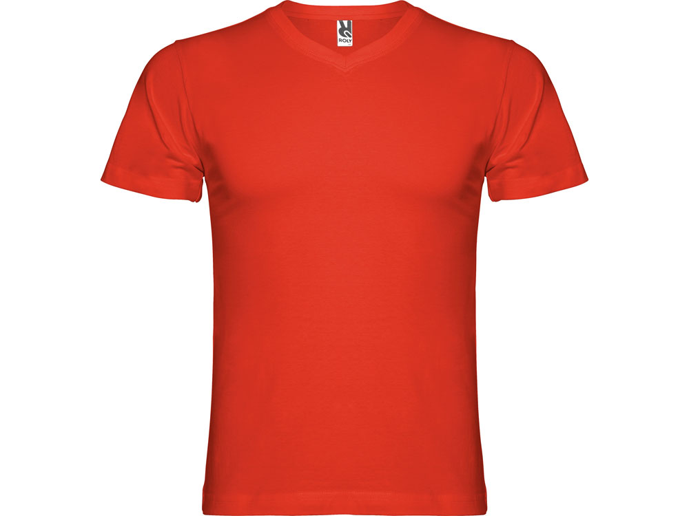 Мужская футболка без боковых швов с коротким рукавом и V-образным вырезом горловины, отделанном рибом 1х1. Горловина и плечевые швы дополнительно укреплены тесьмой.