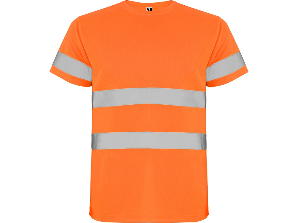 Футболка со светоотражающими элементами с короткими рукавами. Круглая горловина из той же ткани, с усиленными закрытыми швами на внутренней стороне горловины. Две горизонтальные светоотражающие полосы на туловище и одна светоотражающая полоса на рукавах.