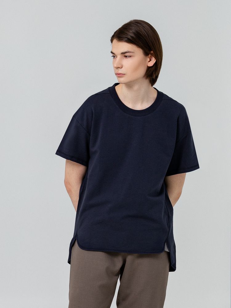 Футболка унисекс свободного кроя со спущенным плечом и смещенными плечевыми и боковыми швами.
