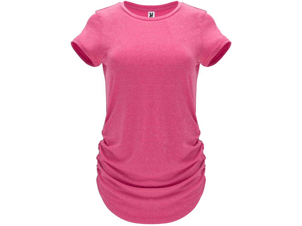 Спортивная футболка с коротким рукавом для женщин. Полотно из полиэстера на ощупь напоминающее хлопок. Круглый вырез горловины обработан бейкой из того же полотна. Эластичная драпировка по боковым швам для лучшей посадки по фигуре. Узкий силуэт.
