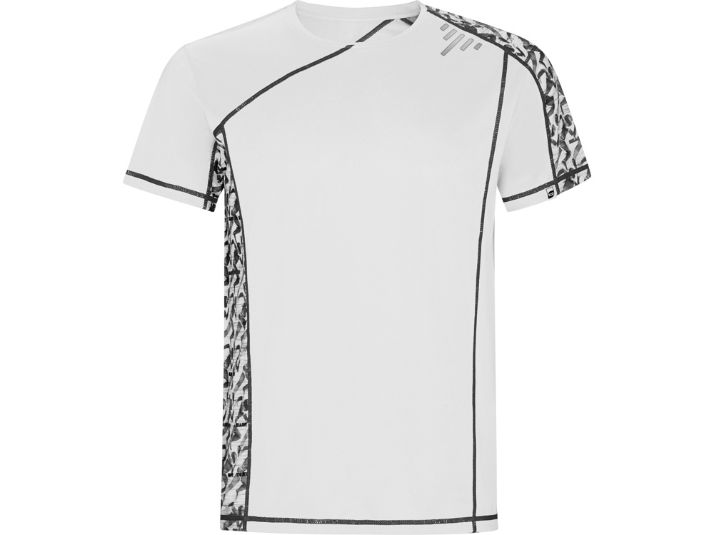 Спортивная футболка с коротким рукавом и принтованными вставками. Контрастные отстрочки плоским швом, светоотражающие элементы на полочке и спинке. Эко лейбл на рукаве.