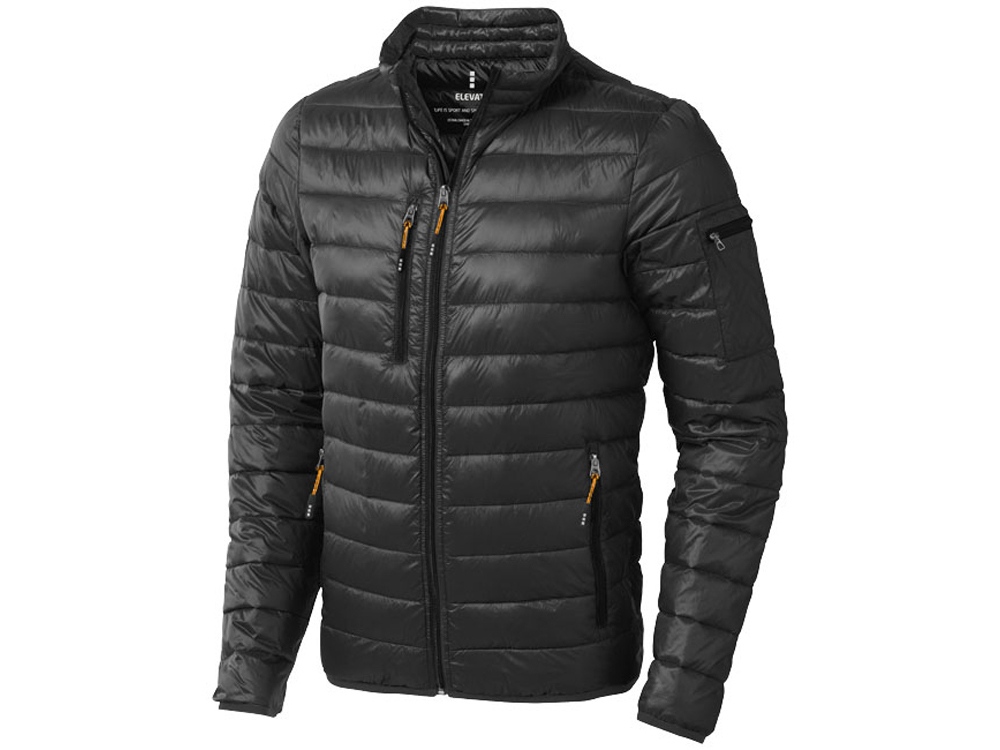 Легкая куртка- пуховик Scotia. Ткань не пропускает пух. Карманы для рук и нагрудный на молнии. Карман на рукаве на молнии можно использовать для нанесения. Резинка на манжетах и внизу куртки. Ремешки на собачку (второй комплект в цвете антрацит).Внутренний противоветровой клапан и защита подбородка. Ткань дышащая, ветронепроницаемая и влагоотталкивающая. Легкий пуховик. Ткань из 100% нейлона с матовым и блестящим водоотталкивающим покрытием, 20D. 90% пух и 10% перо. 115 г/м².