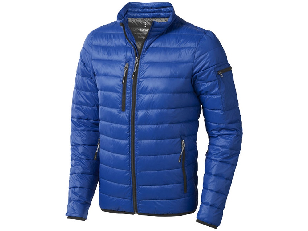 Легкая куртка- пуховик Scotia. Ткань не пропускает пух. Карманы для рук и нагрудный на молнии. Карман на рукаве на молнии можно использовать для нанесения. Резинка на манжетах и внизу куртки. Ремешки на собачку (второй комплект в цвете антрацит).Внутренний противоветровой клапан и защита подбородка. Ткань дышащая, ветронепроницаемая и влагоотталкивающая. Легкий пуховик. Ткань из 100% нейлона с матовым и блестящим водоотталкивающим покрытием, 20D. 90% пух и 10% перо. 115 г/м².