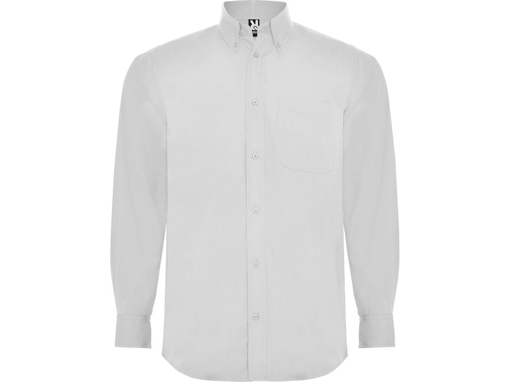 Рубашка мужская с длинным рукавом на семи пуговицах. Накладной карман на груди слева, закругленный низ изделия. Уголки воротника продублированы пуговицами.